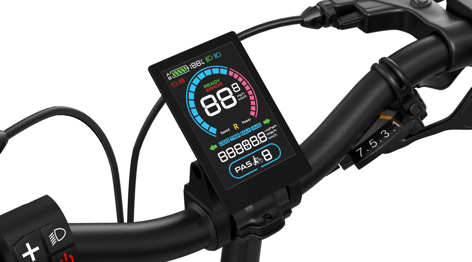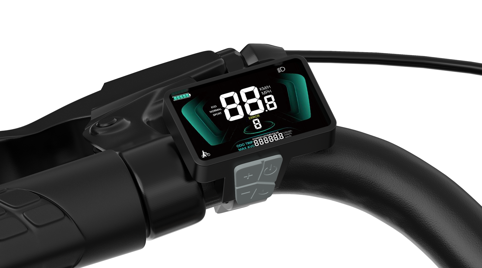 Het lcd-instrument op het stuur geeft belangrijke informatie weer, zoals snelheid, bereik, versnelling en batterijstatus. Daarnaast kun je schakelen tussen KM/H- en MPH- weergave naar jouw voorkeur.