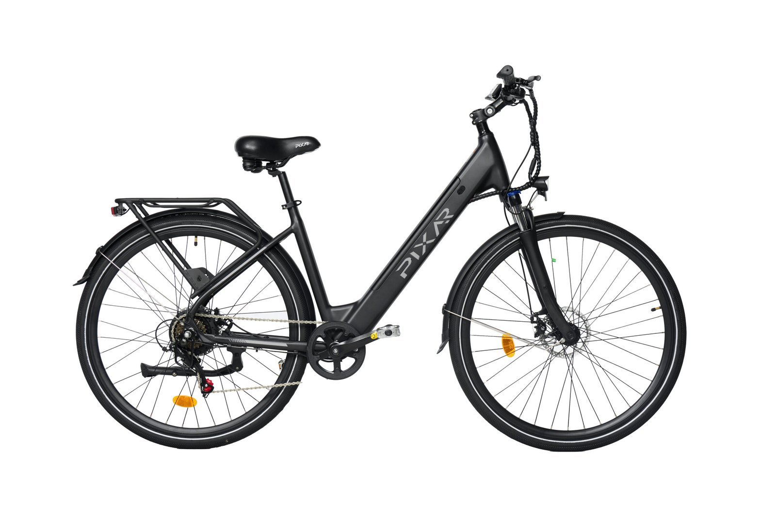 Het frame van de Pixar City 1 is gemaakt van hoogwaardig staal, wat zorgt voor een robuuste en duurzame fiets. Met een trendy ontwerp in zwart of grijs, is deze fiets niet alleen functioneel, maar ook een stijlvol statement. De stalen achterdrager en spatborden voor en achter zijn inbegrepen, zodat je alles wat je nodig hebt veilig kunt vervoeren.Technologie en Gebruiksvriendelijkheid