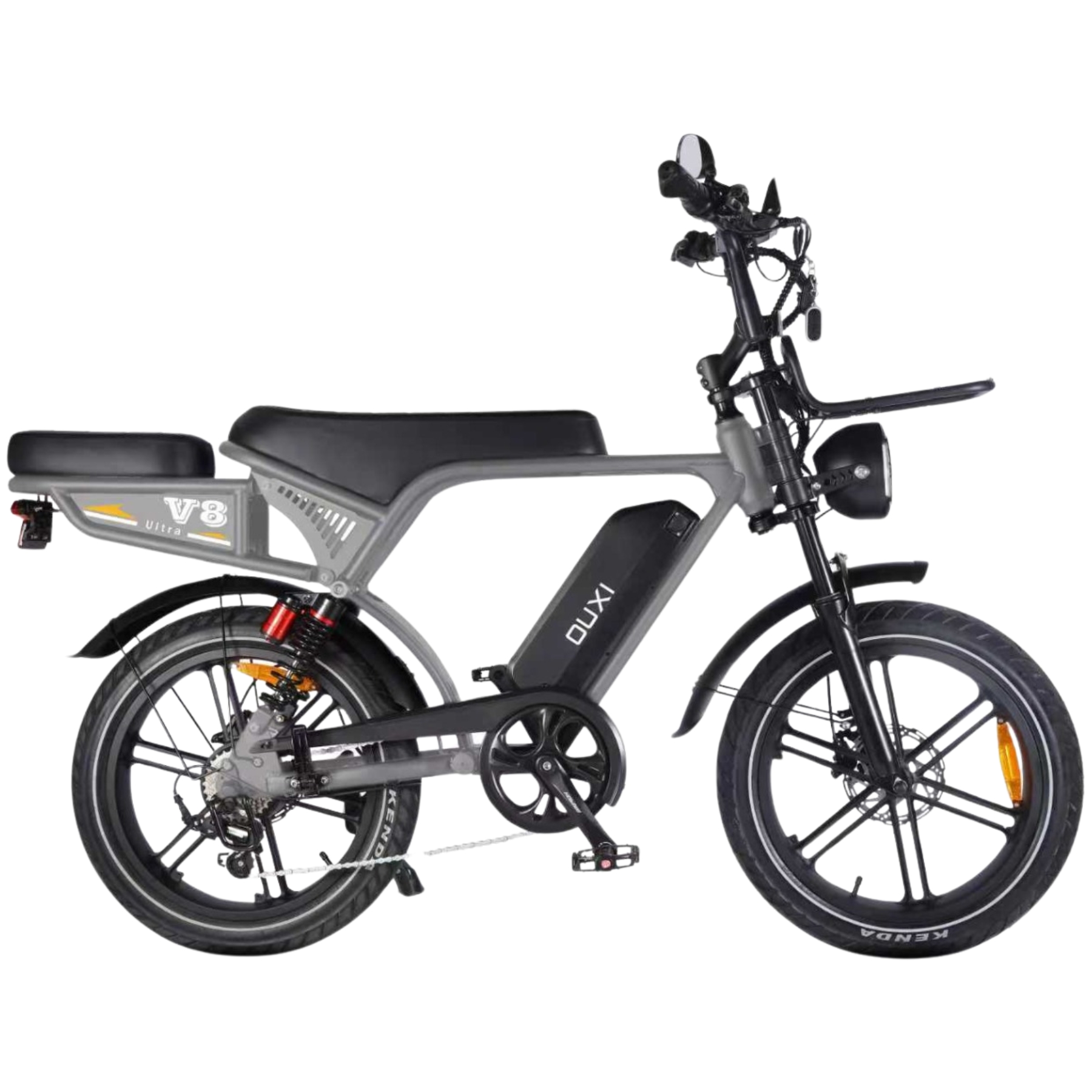V8 Ultra 2025 Edition, Hydraulische Remmen, 250Watt motorvermogen, topsnelheid 25 km/u, 20 inch banden, 7 versnellingen, bereik 40-50 km, Veilig en Straatlegaal nu met gratis tas + achterzitje + voorrekje en alarm!