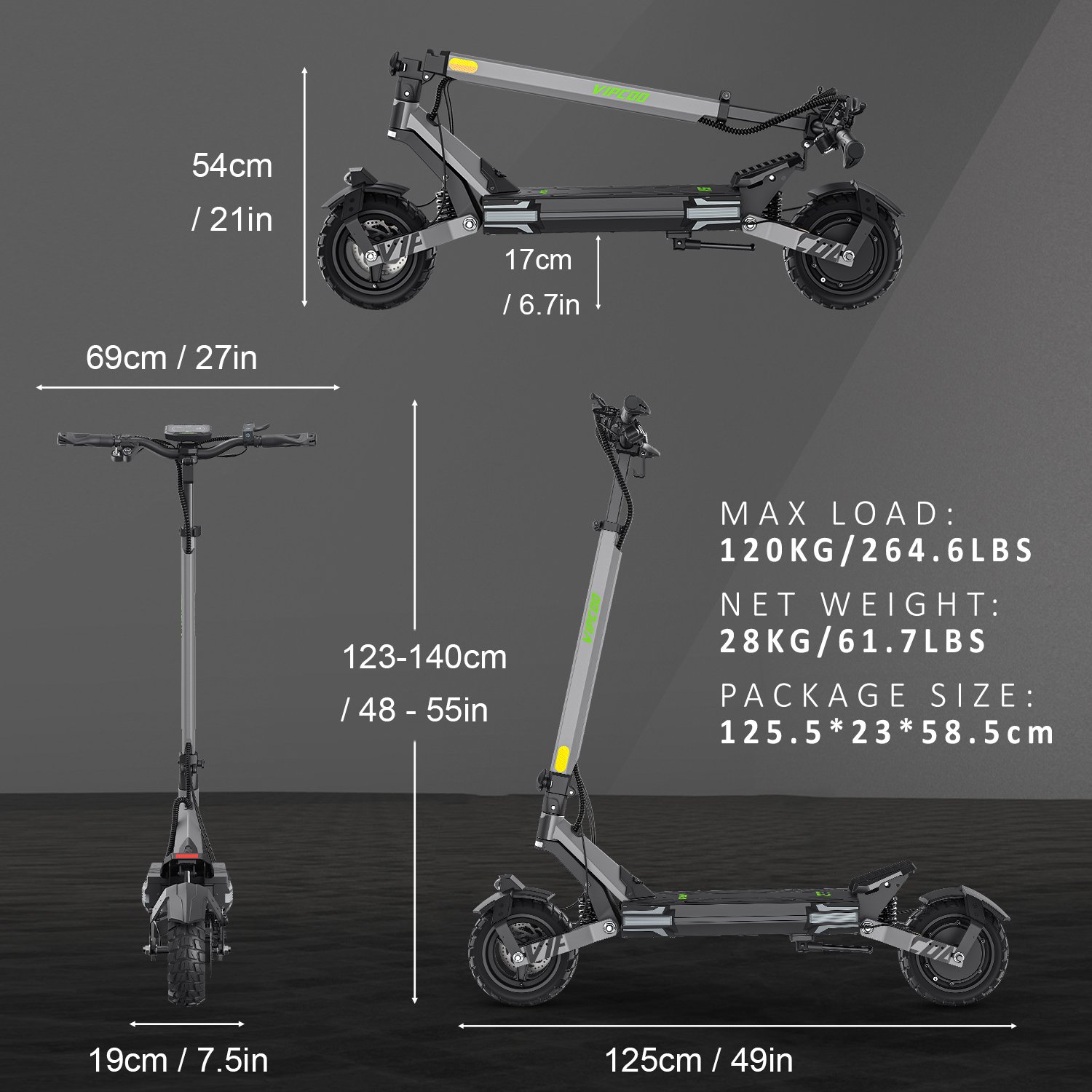 Een van de meest praktische kenmerken van de Vipcoo VS6 is het vouwbare ontwerp. Dit maakt het gemakkelijk om de step op te bergen of mee te nemen in het openbaar vervoer. Met een nettogewicht van 28 kg is de step licht genoeg om te dragen, maar ook robuust genoeg om aan jouw dagelijkse behoeften te voldoen. Het compacte formaat van 125,5 x 23 x 58,5 cm maakt het eenvoudig om de step in je kofferbak of op je balkon op te bergen.
