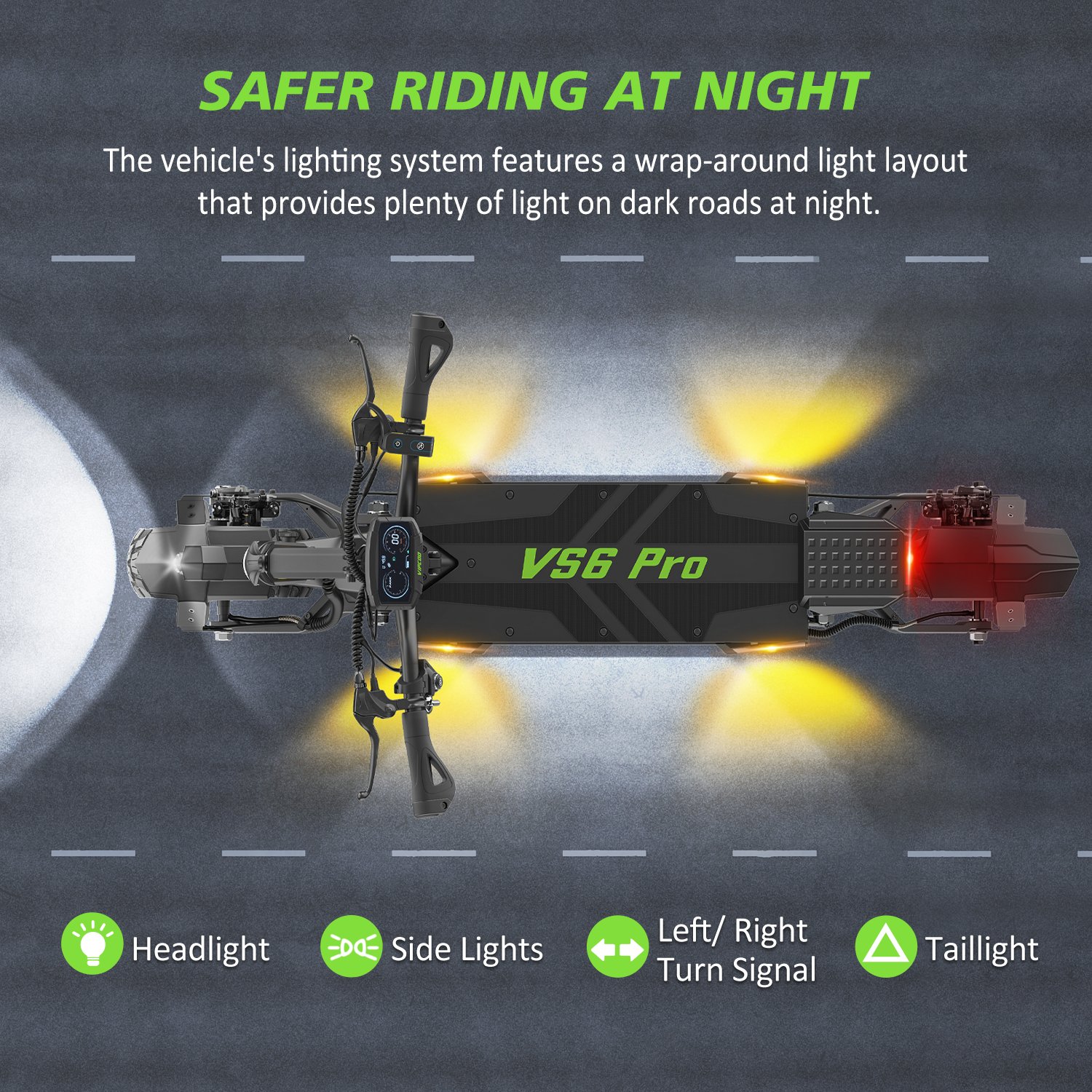 Veiligheid is ook een prioriteit. De Vipcoo VS6 PRO beschikt over een voor- en achter elektronisch schijfrem systeem, dat zorgt voor een snelle en betrouwbare remkracht. Daarnaast zijn er verschillende verlichtingsopties, waaronder een koplamp, richtingaanwijzers en een remlicht, zodat je altijd zichtbaar bent, ongeacht de omstandigheden.