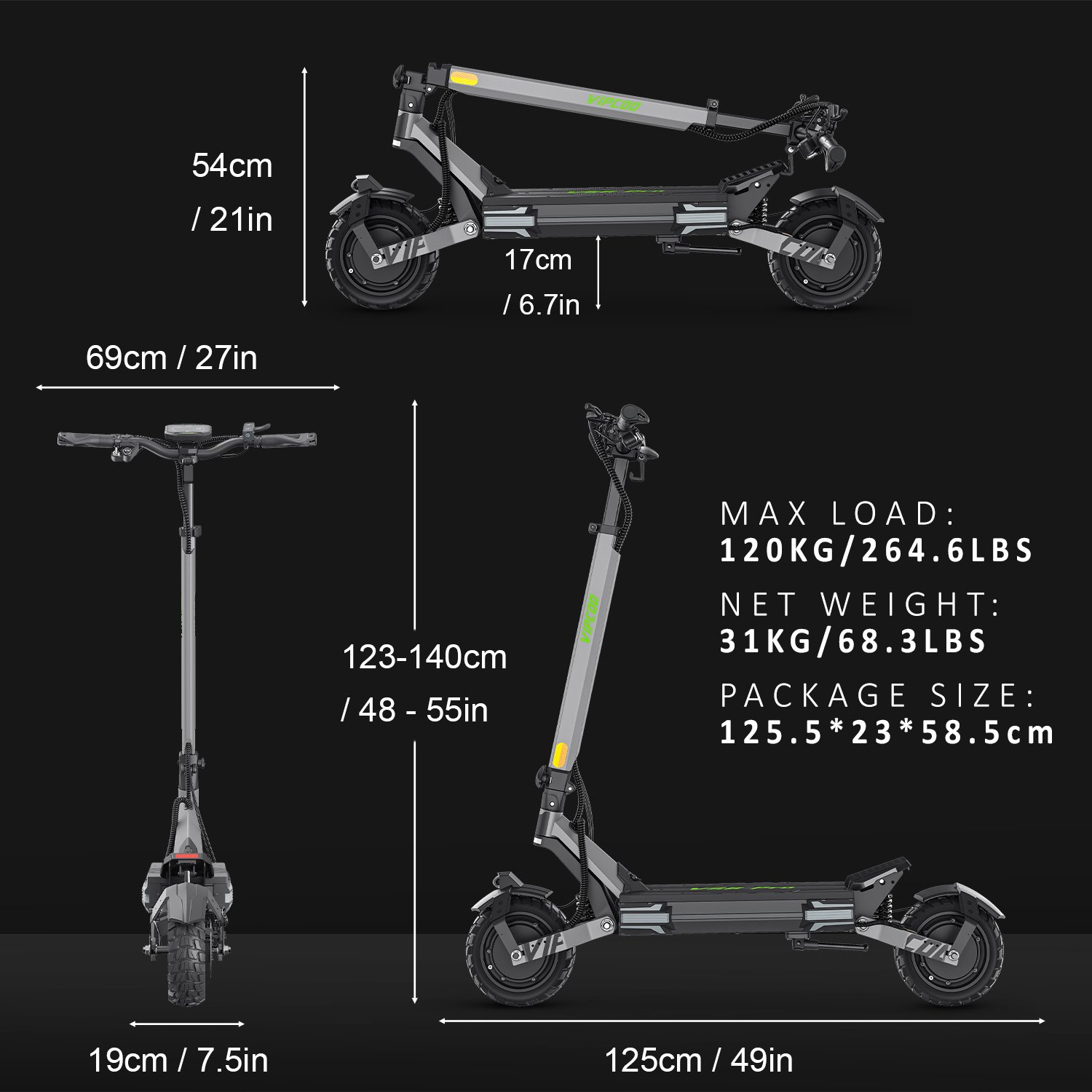 Een van de grootste voordelen van de Vipcoo VS6 PRO is de vouwbaarheid. Het ontwerp maakt het eenvoudig om de step op te vouwen en mee te nemen, waar je ook naartoe gaat. Of je nu naar je werk, school of een weekendje weg gaat, deze step laat je nooit in de steek. Met een verpakking van 125,5 x 23 x 58,5 cm is het gemakkelijk om hem in de kofferbak van je auto of in de trein te vervoeren.